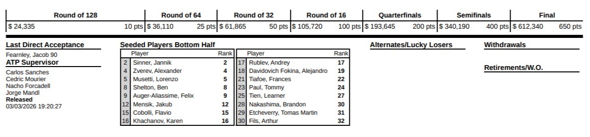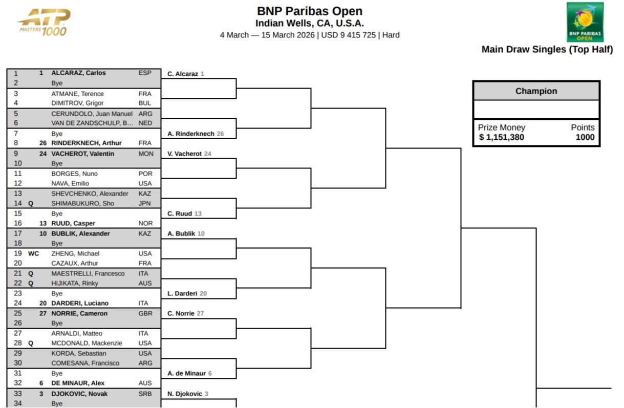 ATPツアーの中で、BNPパリバオープンはマスターズ1000大会に含まれます。優勝者には1,000ポイント、準優勝者には650ポイントが付与されます。また、2026年の大会賞金は、優勝者へ1,151,380ドル、準優勝者へ612,340ドルが予定されています。