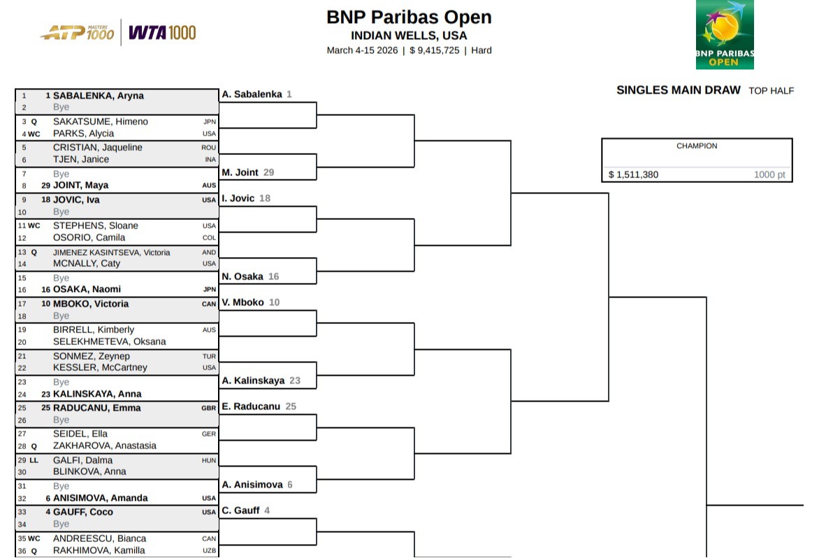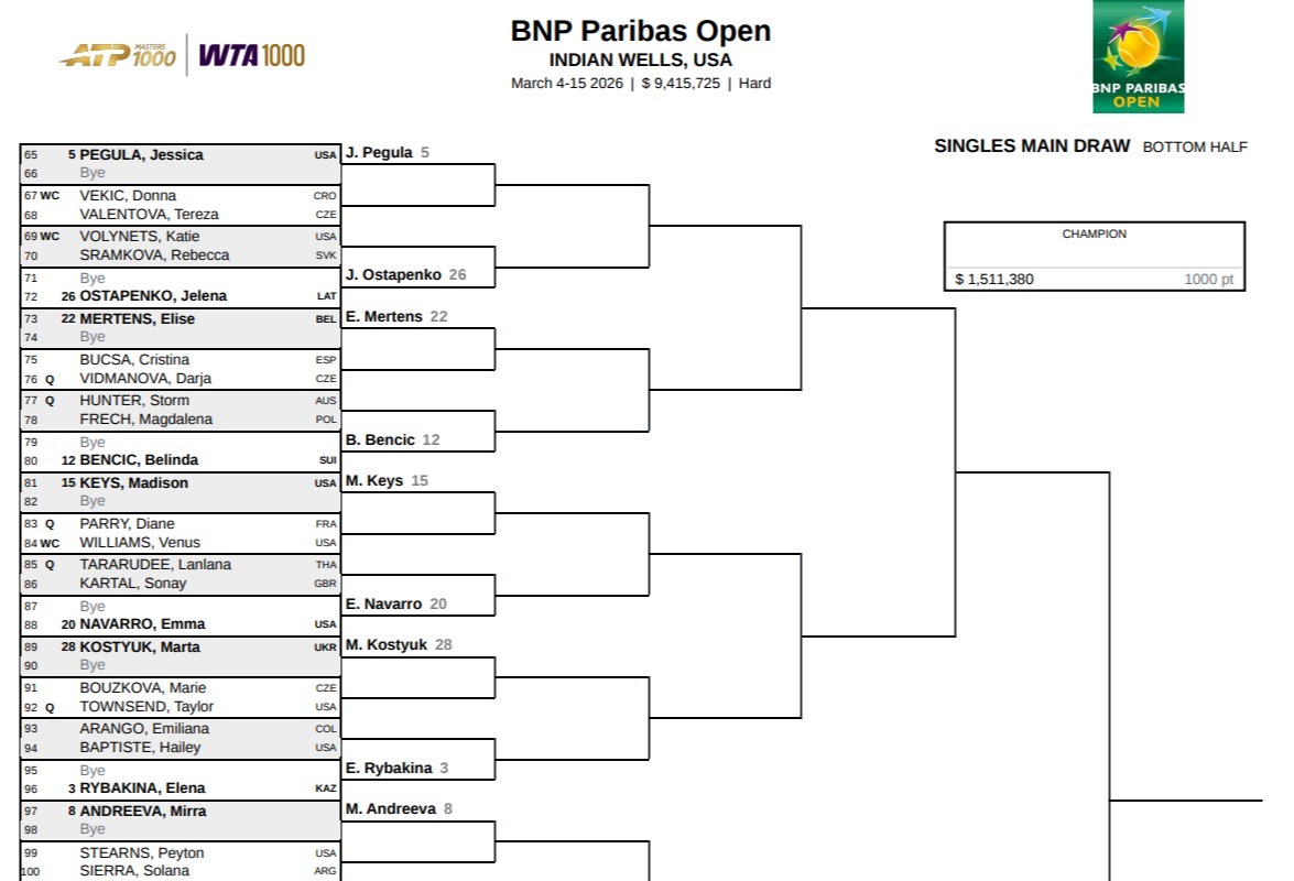 WTAツアーの中で、BNPパリバオープンはWTA1000に含まれます。優勝者には1,000ポイント、準優勝者には650ポイントが付与されます。また、2026年の大会賞金は、優勝者へ1,511,380ドル、準優勝者へ612,340ドルが予定されています。