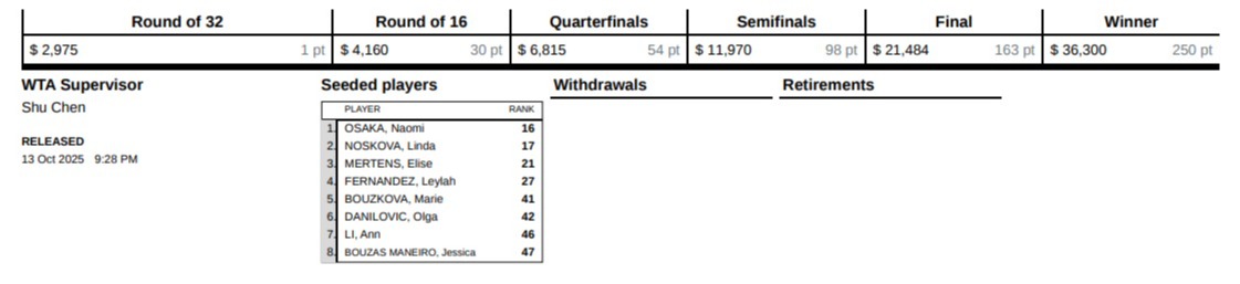 WTAツアーの中で、木下グループ・ジャパンオープンは、WTA250の大会に含まれます。優勝者には250ポイント、準優勝者には163ポイントが付与されます。また、2025年の大会賞金は、優勝者へ36,300ドル、準優勝者へ21,484ドルが予定されています。
