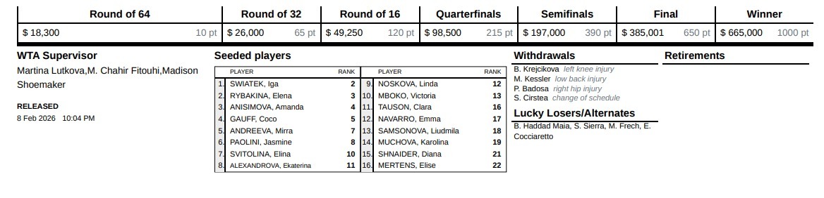 WTAツアーの中で、カタール・トータル・オープンは、WTA1000の大会に含まれます。優勝者には1000ポイント、準優勝者には650ポイントが付与されます。また2026年大会での優勝賞金は、優勝者へ665,000ドル、準優勝者へ385,001ドルが予定されています。