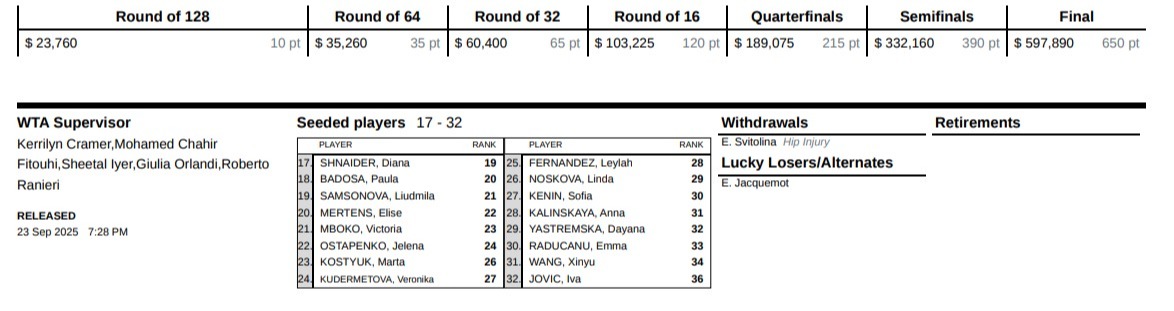 --- | 1回戦 | 9/24(水)ATP:--- / WTA:12:00~ | --- | ATP:--- WTA:WTA TV |