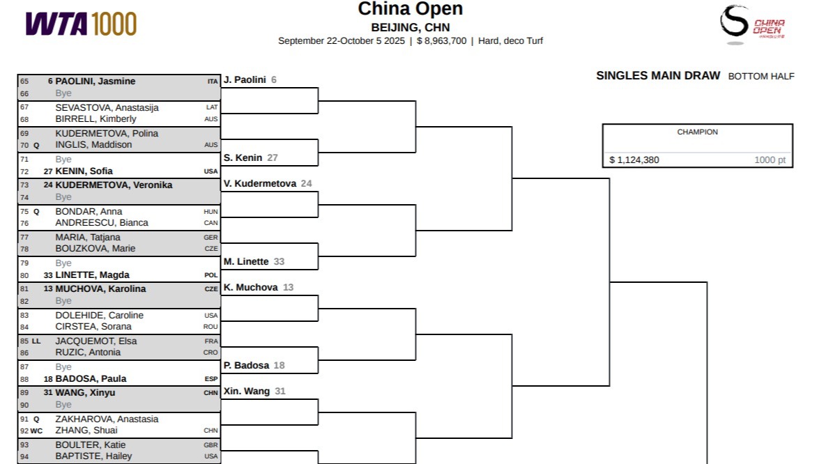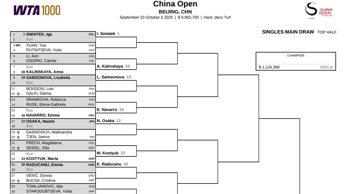 WTAツアーの中で、チャイナ・オープンは、WTA1000の大会に含まれます。優勝者に1000ポイント、準優勝者には650ポイントが付与されます。