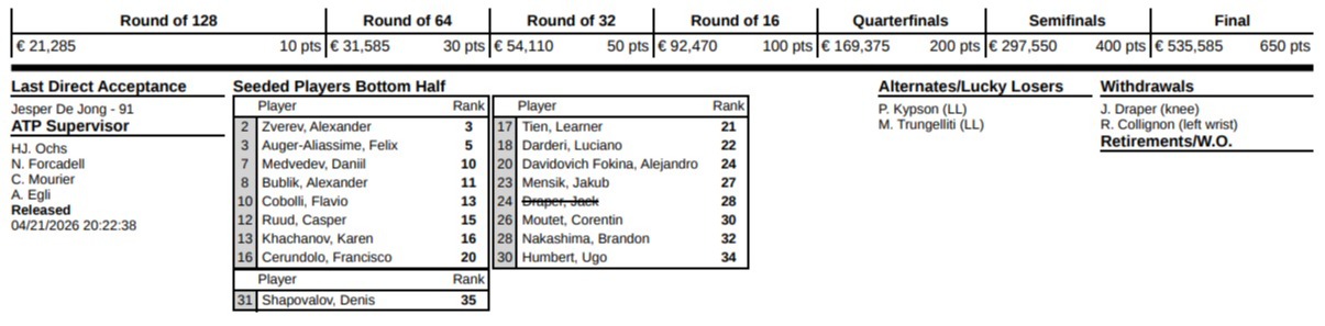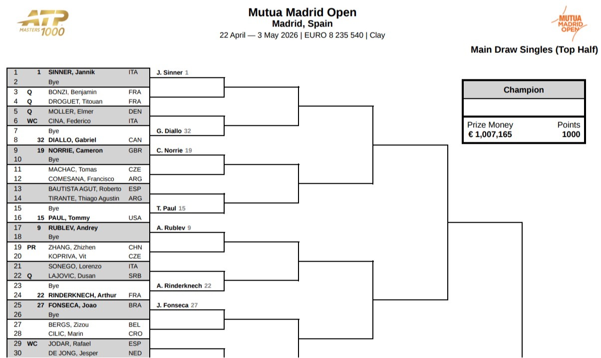 ATPツアーの中で、マドリード・オープンはマスターズ1000大会に含まれます。優勝者には1,000ポイント、準優勝者には650ポイントが付与されます。また、2026年の大会賞金は、優勝者へ1,007,165ユーロ、準優勝者へ535,585ユーロが予定されています。