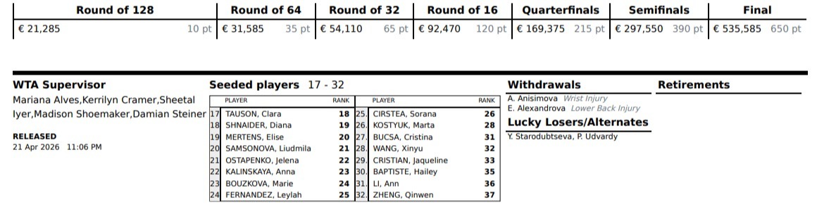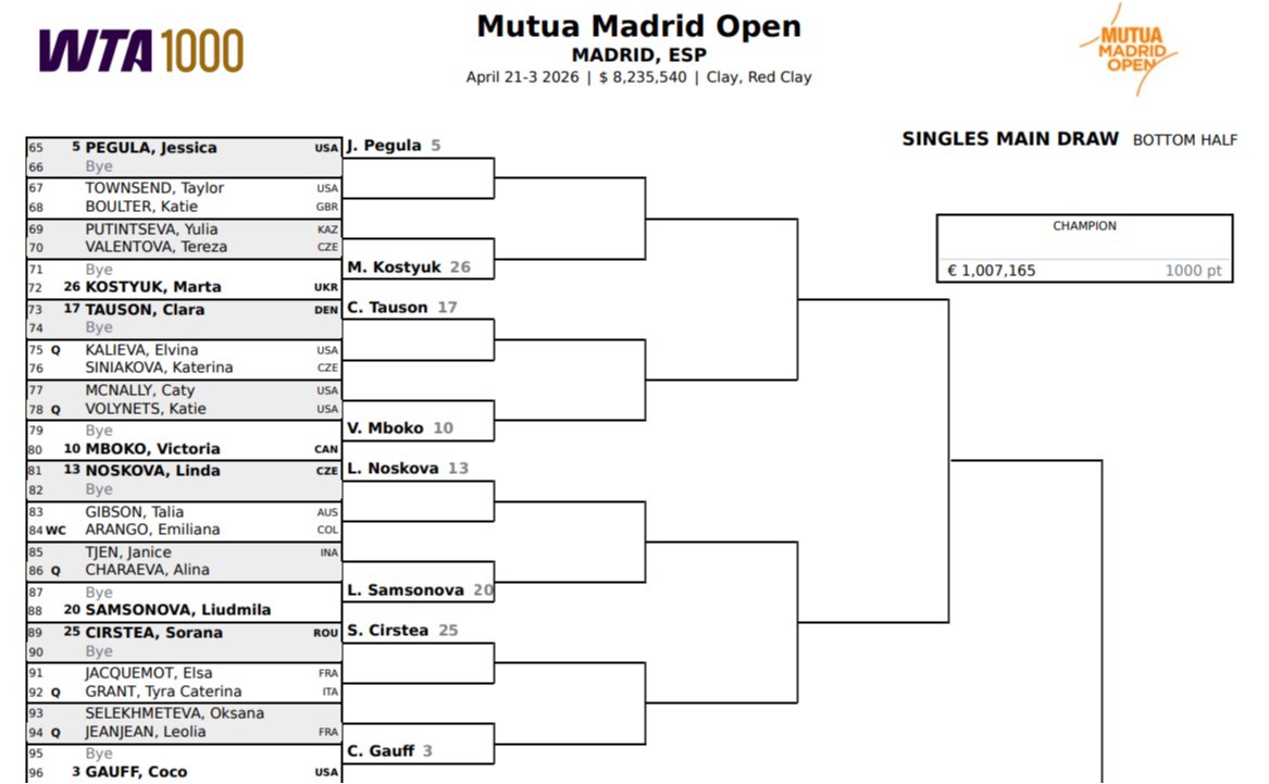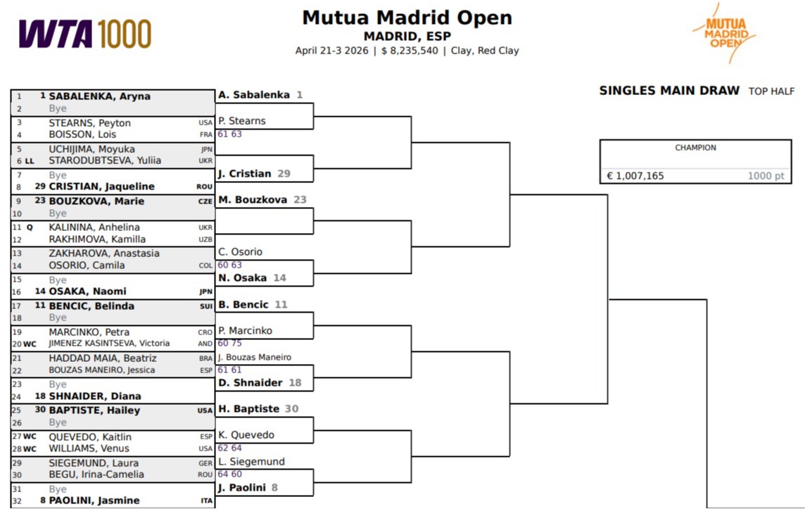 WTAツアーの中で、マドリード・オープンはWTA1000に含まれます。優勝者には1,000ポイント、準優勝者には650ポイントが付与されます。また、2026年の大会賞金は、優勝者へ1,007,165ユーロ、準優勝者へ535,585ユーロが予定されています。
