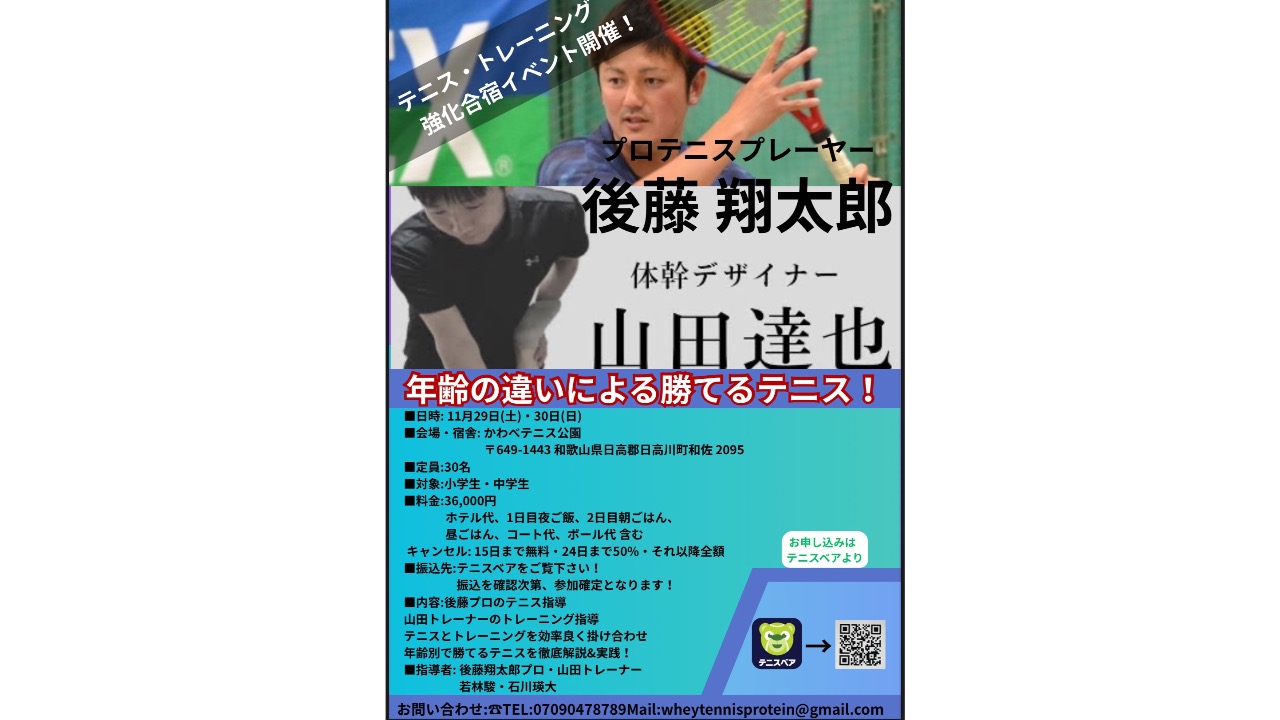 後藤翔太郎プロ✖️山田トレーナーの「本気で強くなる‼️」「将来プロになる🎾」をテーマに現在の各年齢で何が必要なのかを事細かくレッスン+講義で行います!