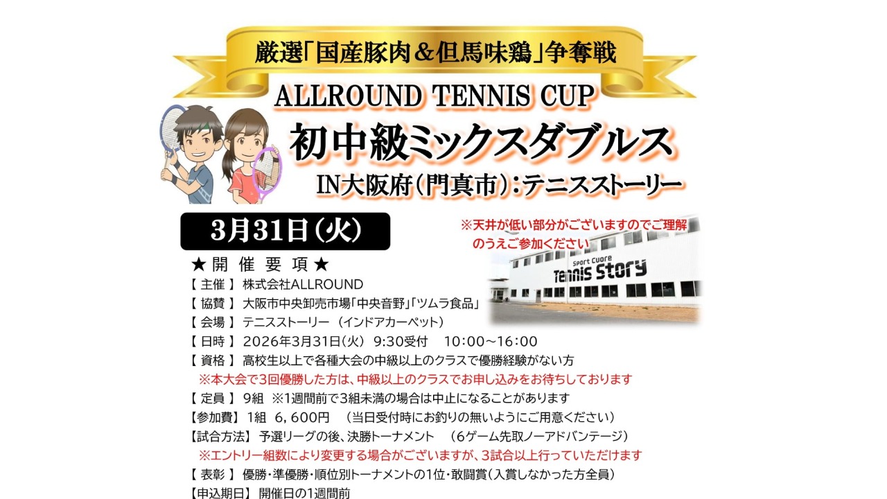 【市場厳選!国産豚肉&但馬味鶏争奪!】初中級ミックスダブルス大会 門真市:テニスストーリー
