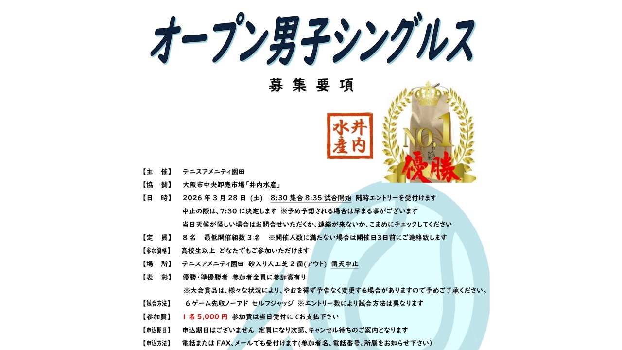 (定員になり次第、キャンセル待ちのご案内になります。なお、 テニスベア以外でも申込みを受け付けておりますので、参加人数の表記が実際と異なることがありますので予めご了承ください。)