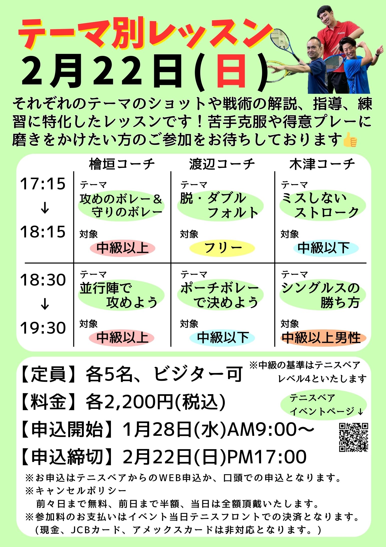 参加料はイベント当日、テニスフロントでキャッシュレスでのお支払いとなります。