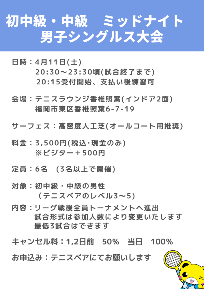 インドア ミッドナイト初中・中級 男子シングルス大会