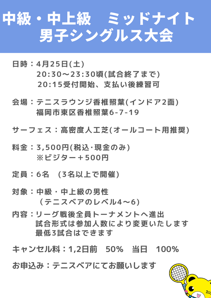 インドア ミッドナイト中級・中上級 男子シングルス大会