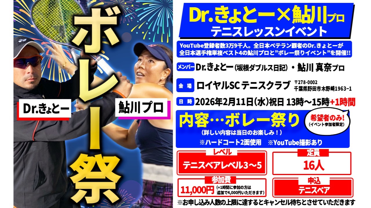 千葉県にある【ロイヤルSCテニスクラブ】にて、Dr.きょとー&鮎川真奈プロによる【ボレー徹底レッスン】を行います!2面16人、1面8人の少人数制レッスン!