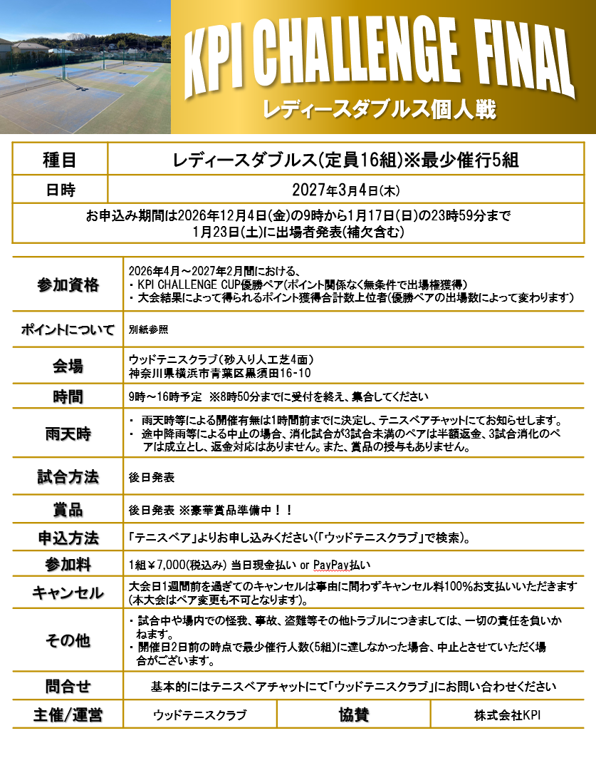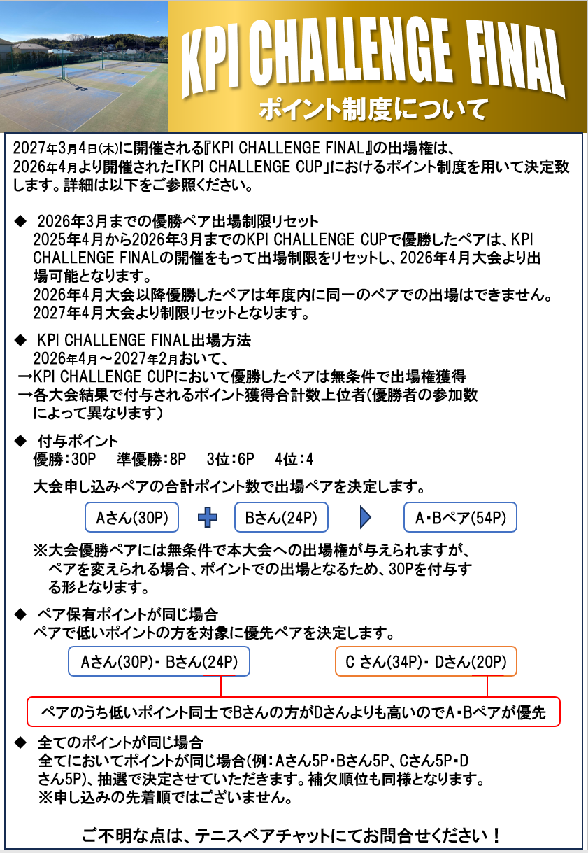 大会優勝ペアは2027年3月4日開催の「KPI CHALLENGE FAINAL」への参加資格が与えられます。また、1位トーナメントに進出したペアは順位に準じてFINAL大会参加基準のポイントが与えられます(2月大会はポイント対象外の大会となります)。詳細は別紙をご参照ください。