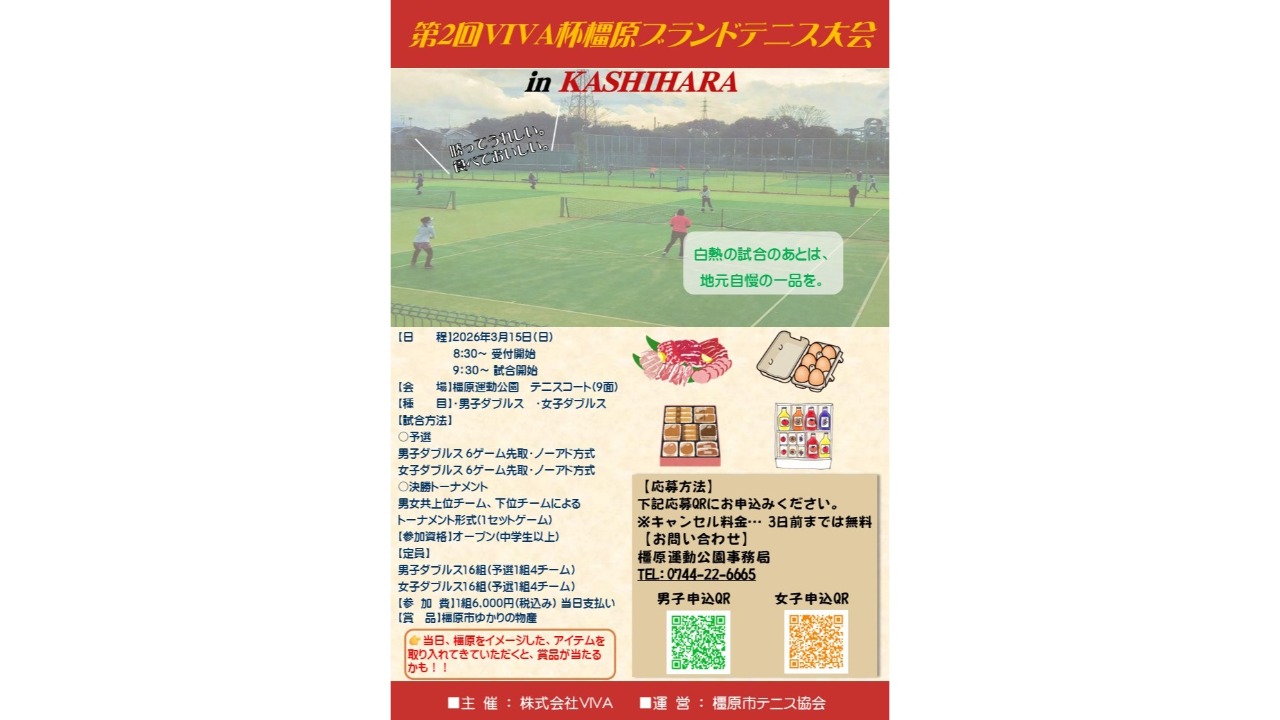 橿原運動公園でテニス大会を行います。当日の各種賞品は、橿原ゆかりの賞品が、もらえます。特別賞もございます。ご参加お待ちしております。