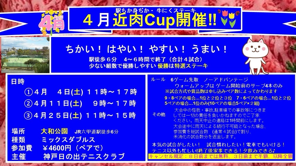 🍖近肉杯🍖4試合4600円(ペアで)4月11日(土)大和公園9時〜17時 現在14ペア