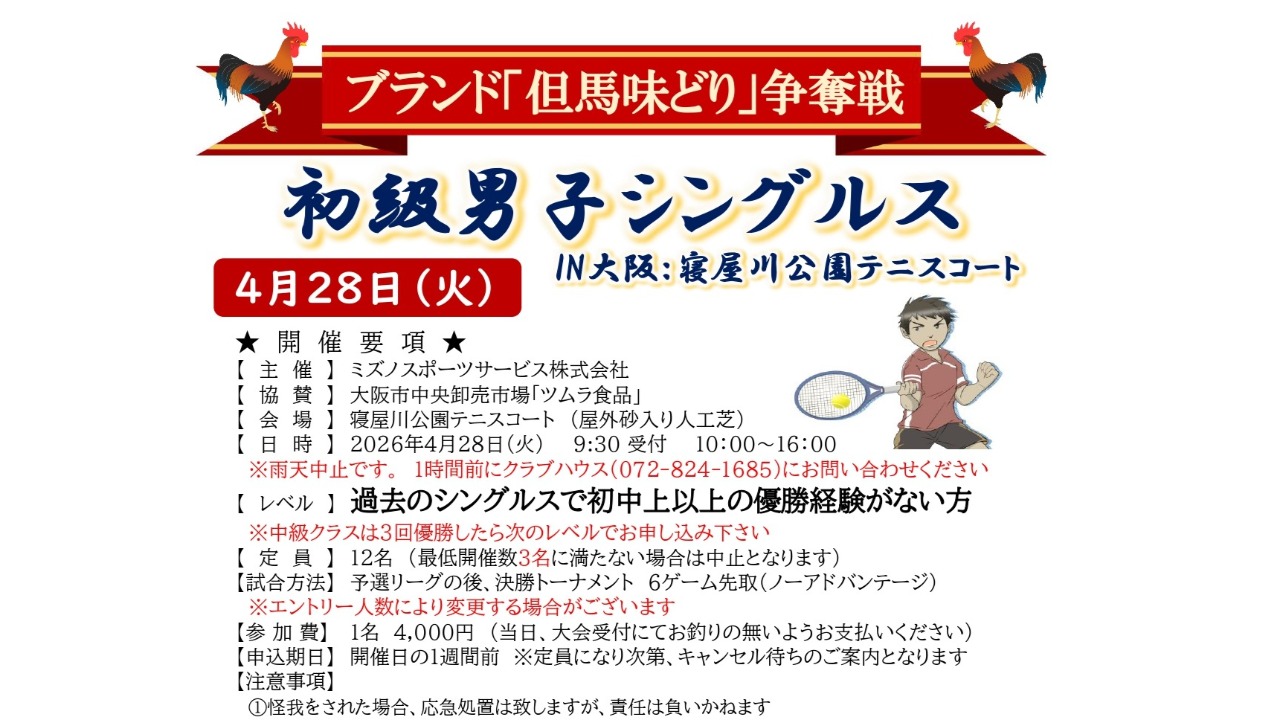 【市場直送!ブランド但馬あじ鶏争奪!】初級男子シングルス大会 寝屋川公園テニスコート