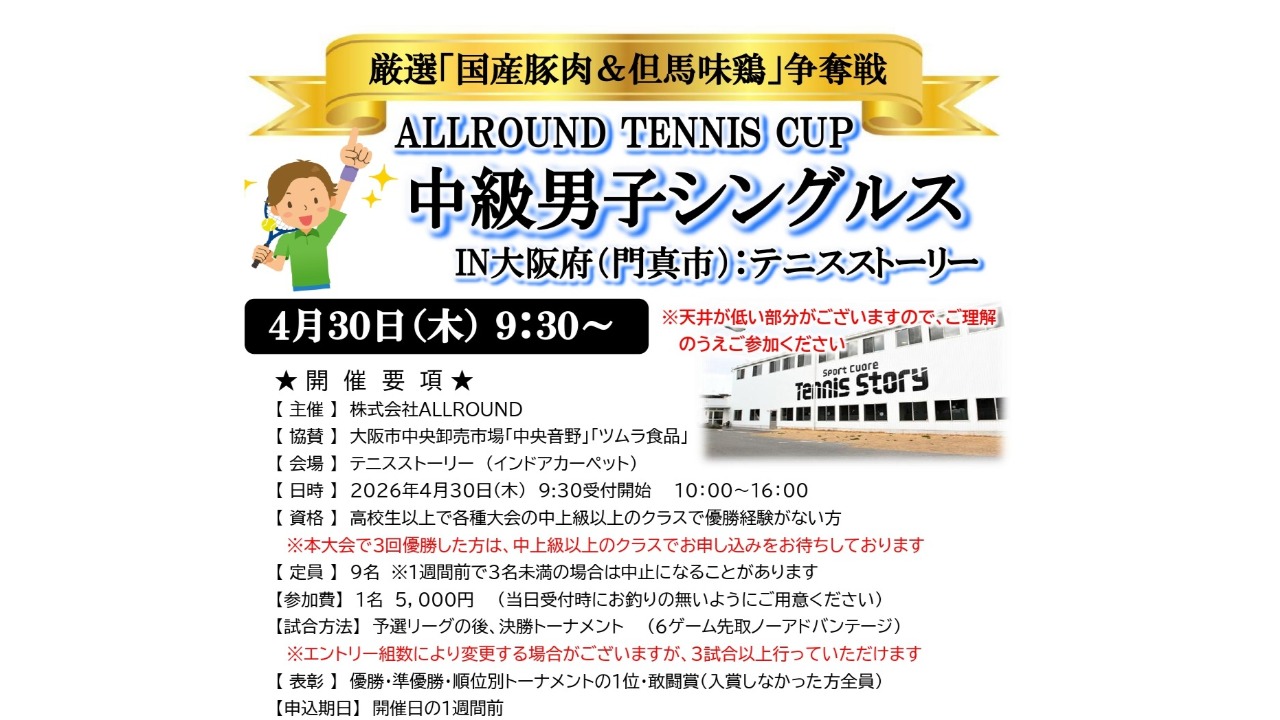 【市場厳選!国産豚肉&但馬味鶏争奪!】中級男子シングルス大会 門真市:テニスストーリー