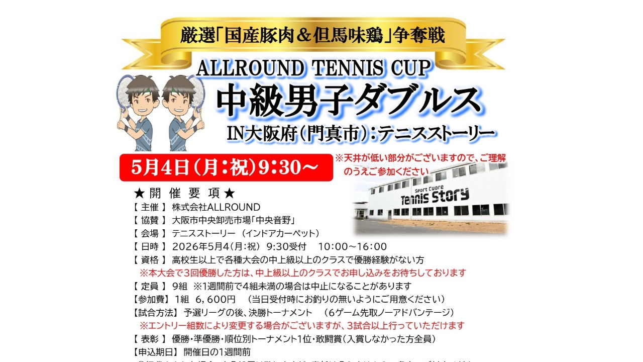 【市場厳選!国産豚肉&但馬味鶏争奪!】中級男子ダブルス大会 門真市:テニスストーリー