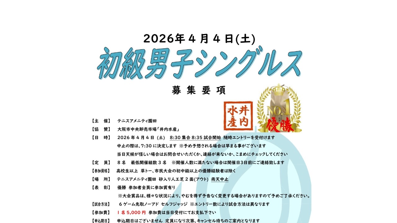 大会日の1週間前以降のキャンセル、又は試合進行に不都合が出る場合(その場合棄権となる) では、参加費の全額をお支払い頂きますのでご了承ください。