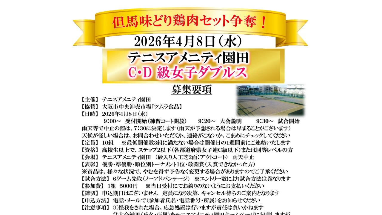 【市場直送!ブランド但馬味どり 鶏肉セット争奪!】CD級女子ダブルス大会 テニスアメニティ園田