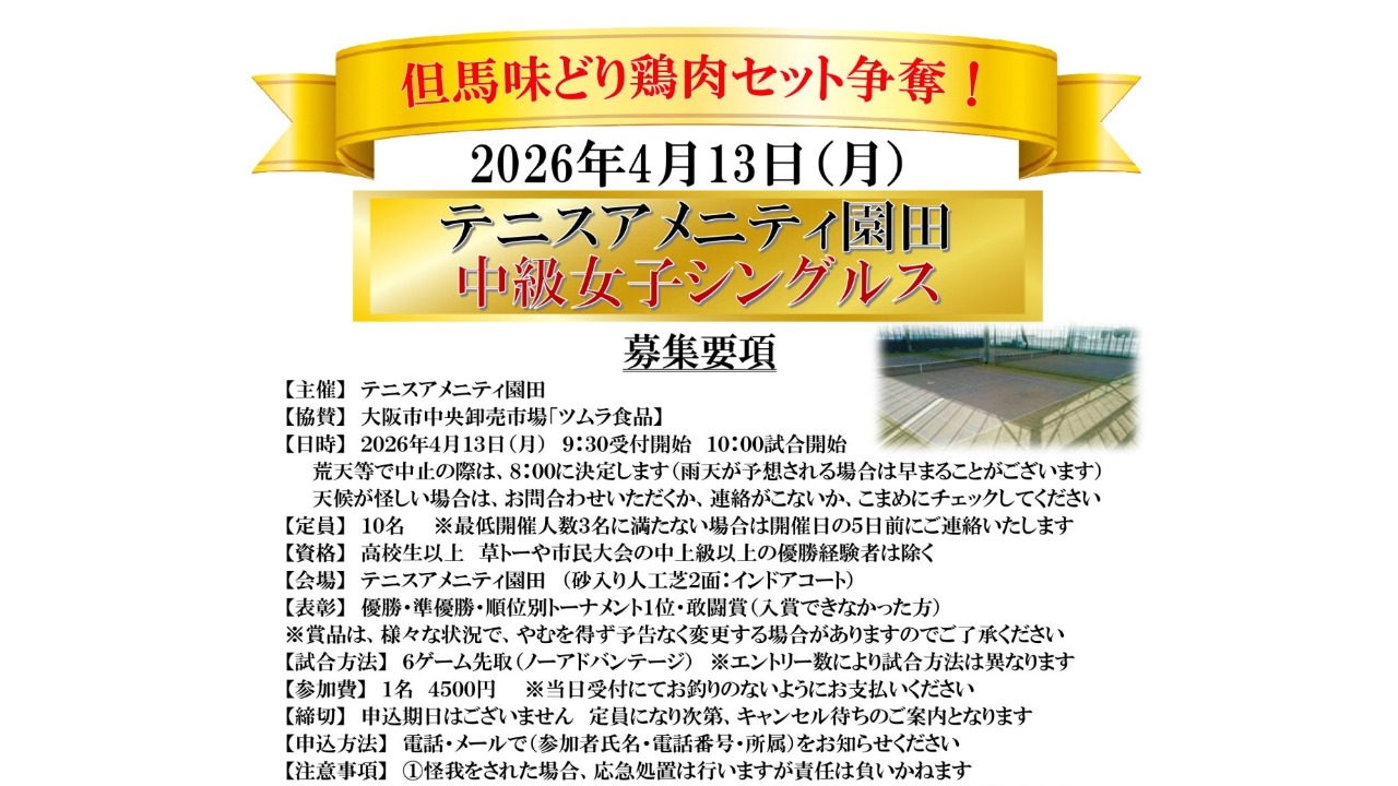 【市場直送!ブランド但馬味どり 鶏肉セット争奪!】中級女子シングルス大会 テニスアメニティ園田