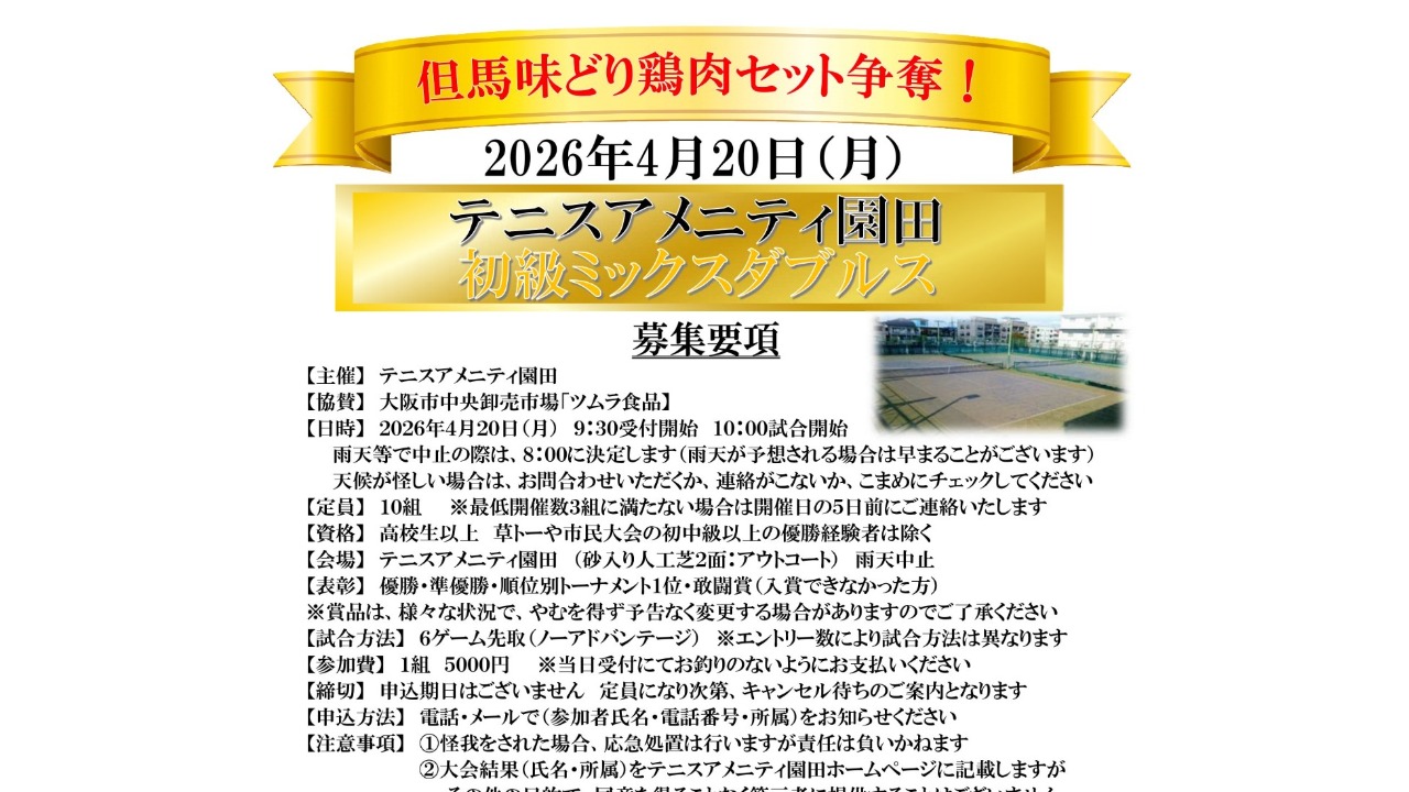【市場直送!ブランド但馬味どり鶏肉セット争奪!】初級ミックスダブルス大会 テニスアメニティ園田