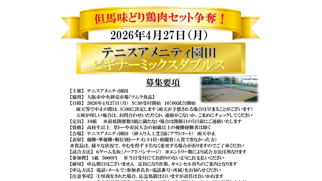 【市場直送!ブランド但馬味どり鶏肉セット争奪!】ビギナーミックスダブルス大会 テニスアメニティ園田