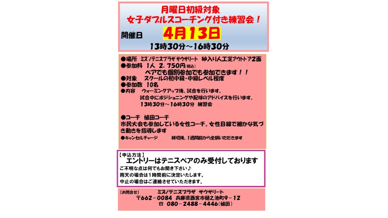 残り4名!女子ダブルス初級・初中級対象コーチング付き練習会
