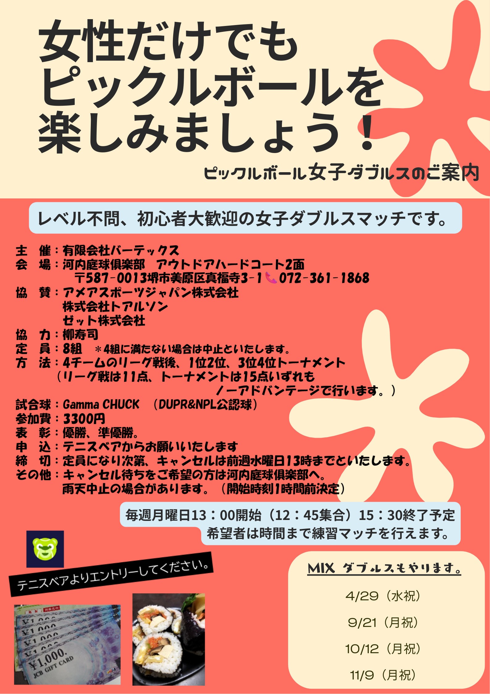 レベル不問、初心者歓迎、女子ダブルス大会