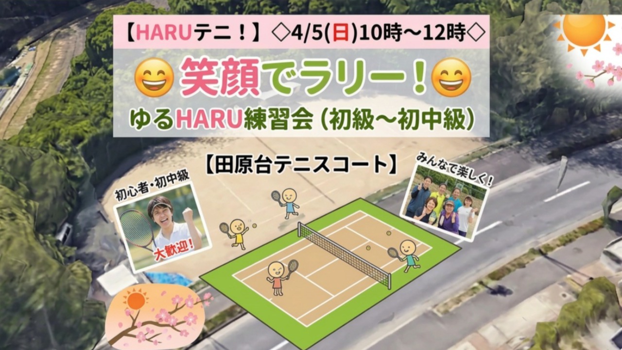 【HARUテニ!】4/5(日)10時~ 笑顔でラリー!ゆるHARU練習会(初級~初中級)【田原台】