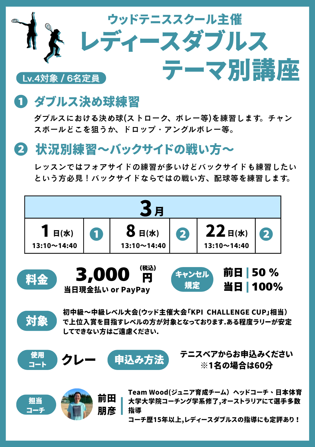 試合で必要なこんなショットをもっと練習したい、状況に合わせた練習がしたい、今さら聞けない基本を練習したいなどなかなかレッスンではできないことを女性限定のレディースダブルステーマ別講座で解決致します!コーチ歴16年、オーストラリアにて選手多数指導し、レディースダブルスの指導にも定評がある前田コーチが担当致します。