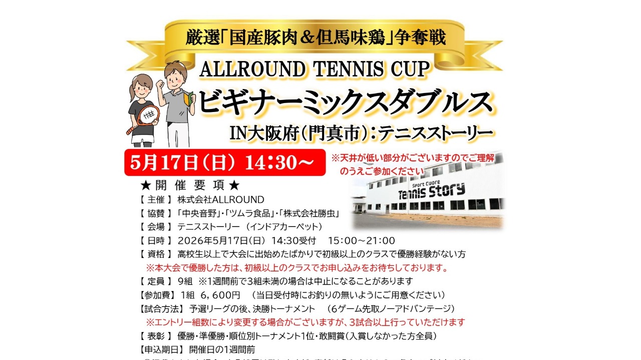【市場厳選!国産豚肉&但馬味鶏争奪!】ビギナーミックスダブルス大会 門真市:テニスストーリー