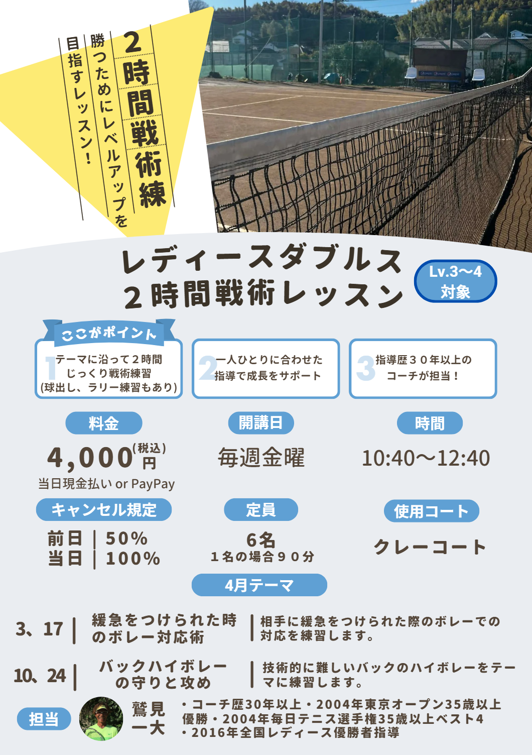 本レッスンはレディースダブルス限定の2時間レッスンとなっております。テーマに沿って戦術練習中心に行います(球出し練習、ラリー練習も行います)。2時間あるからこそじっくり戦術練習の中で試合に勝つためのレベルアップを目指します。