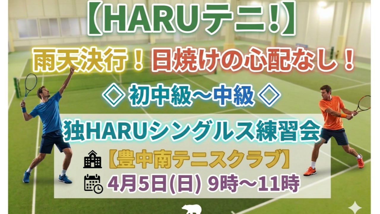 【HARUテニ!】雨天決行!◇初中級~中級◇独HARUシングルス練習会【豊中南テニスクラブ】