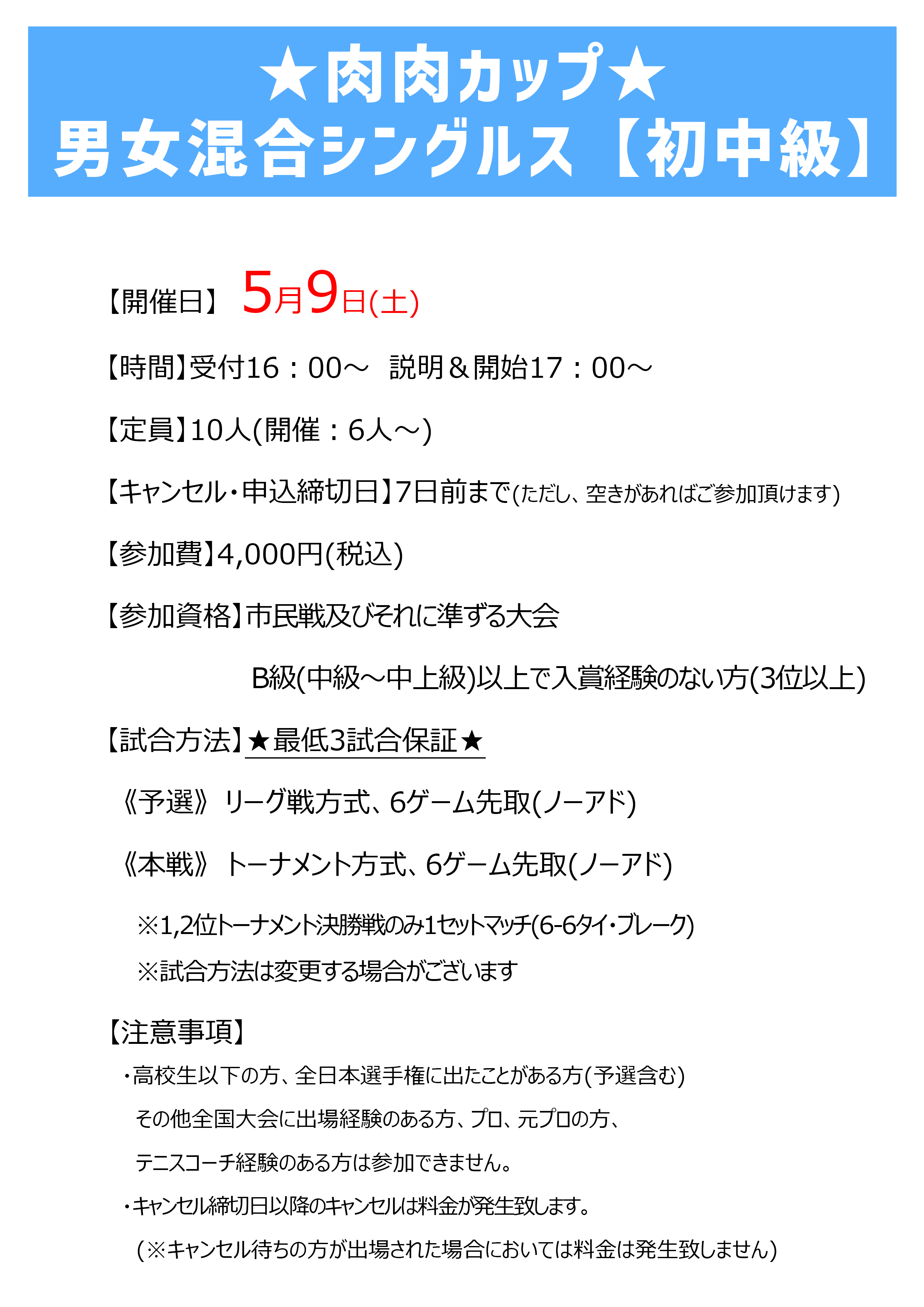 ※高校生以下、全日本選手権に出たことがある方(予選含む)、テニスコーチ経験のある方、その他全国大会に出場経験のある方、プロ、元プロの方、上記に当てはまる方は参加できません。