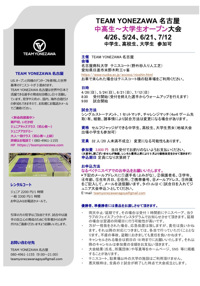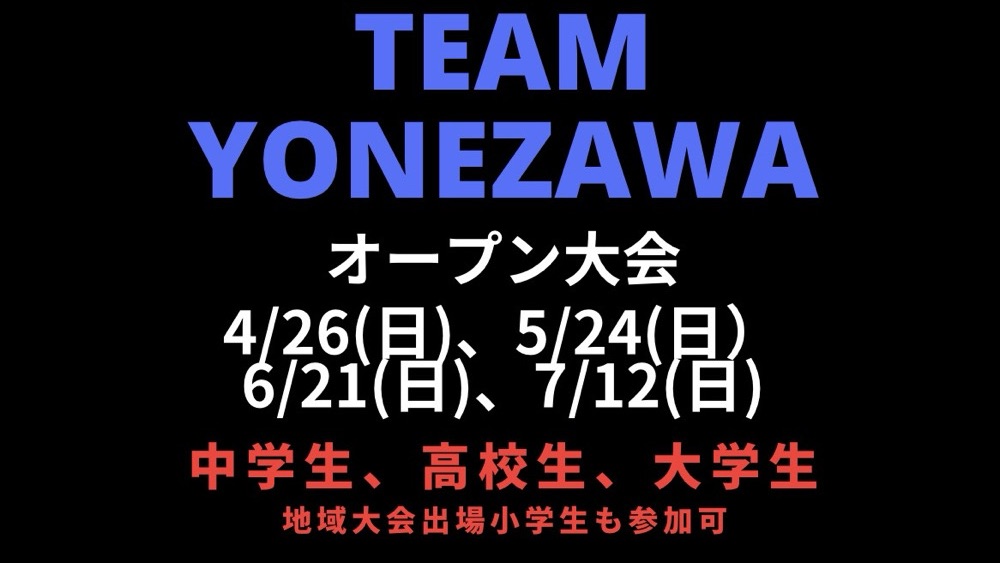 TEAM YONEZAWA中高生、大学生オープン大会(地域大会出場小学生も参加可)