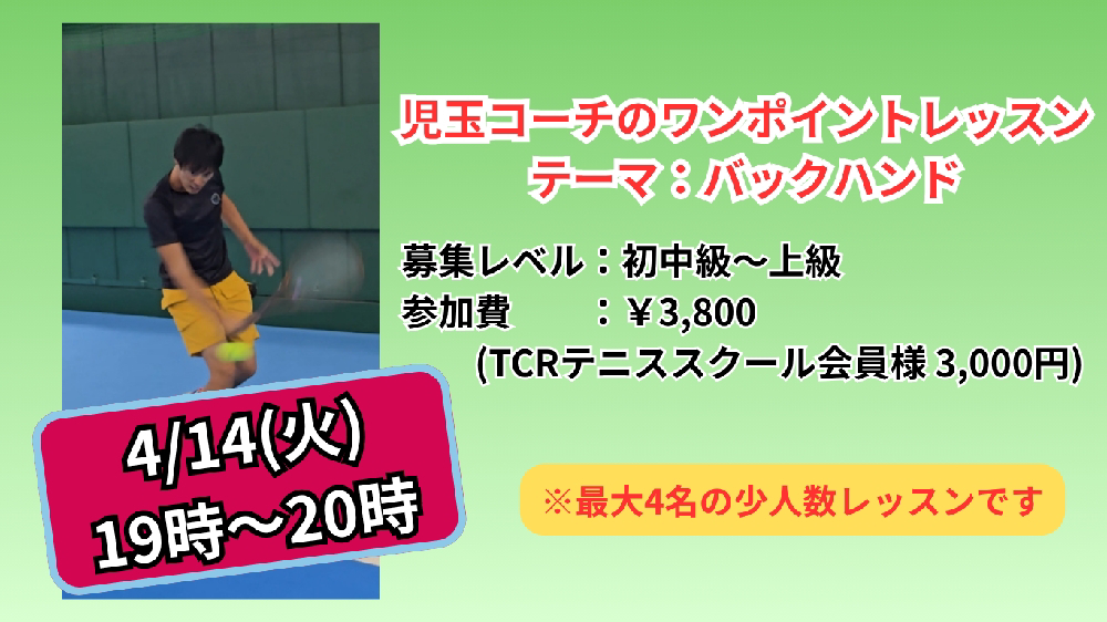 TCR テニススクールの児玉コーチによるワンポイントレッスンです!