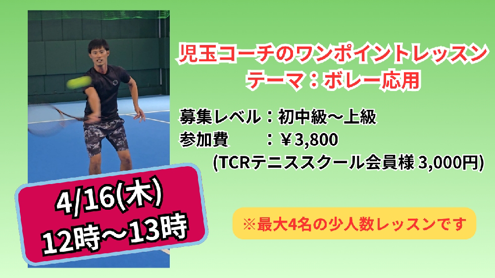 TCR テニススクールの児玉コーチによるワンポイントレッスンです!