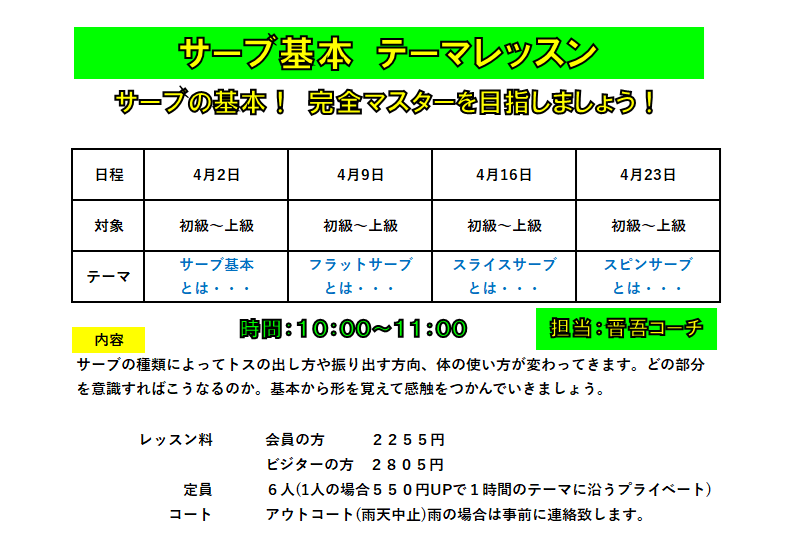 ★ 水曜日 サーブ基本 テーマレッスン ★