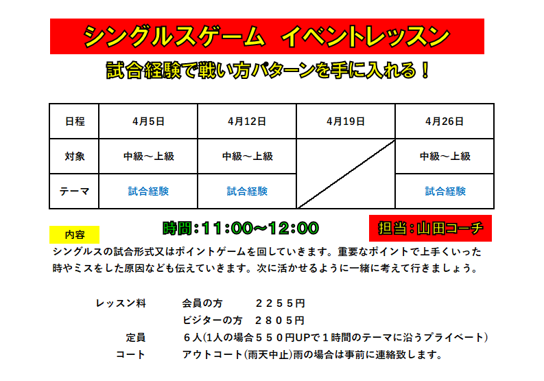 ★ 日曜日 シングルスゲーム イベントレッスン ★