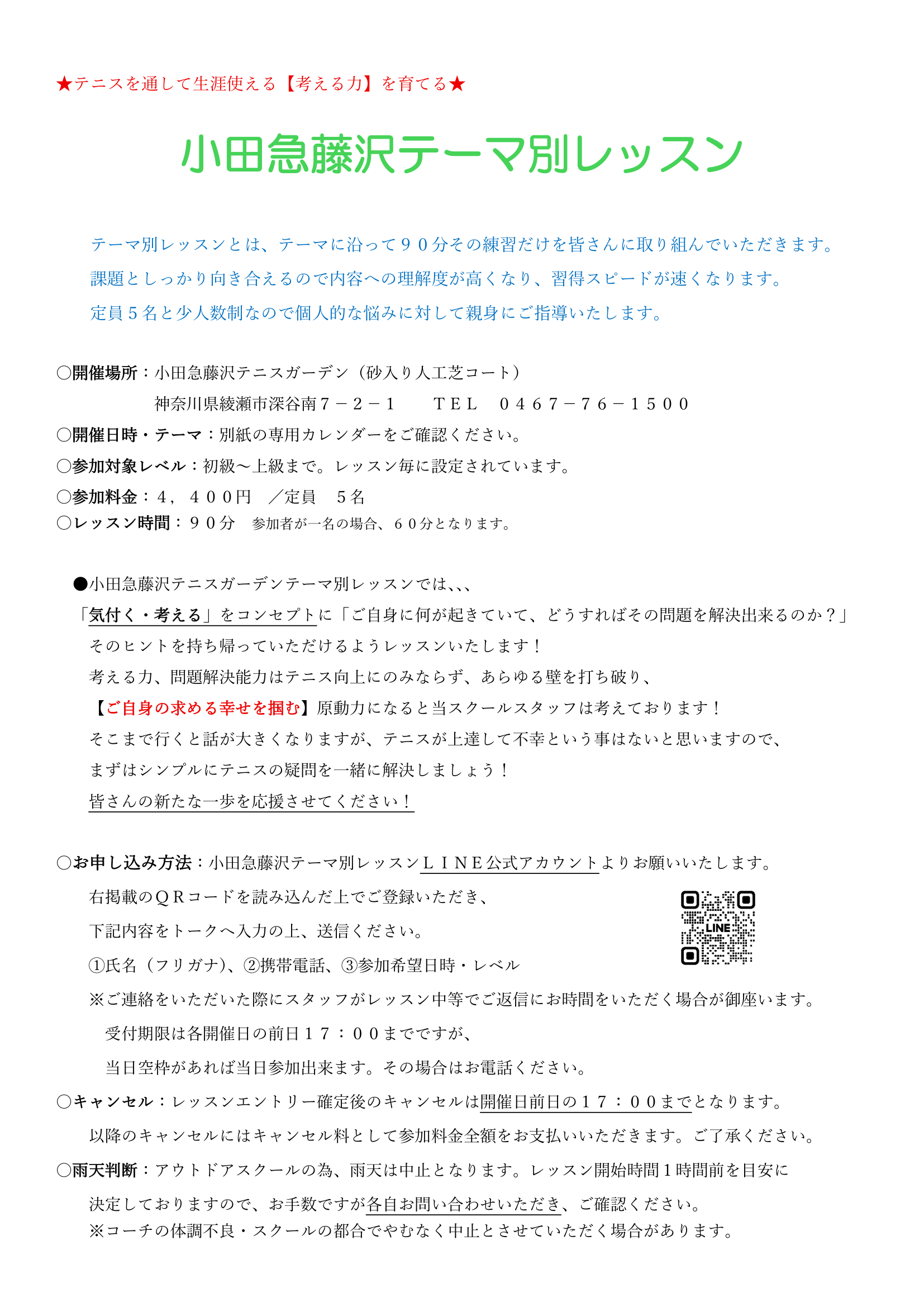 小田急藤沢テニスガーデンのテーマ別レッスンです。