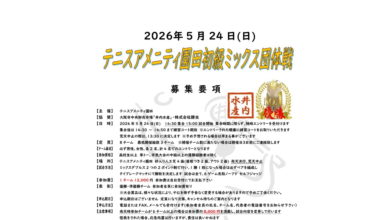大会日の1週間前以降のキャンセル、又は試合進行に不都合が出る場合(その場合棄権となる) では、参加費の全額をお支払い頂きますのでご了承ください。