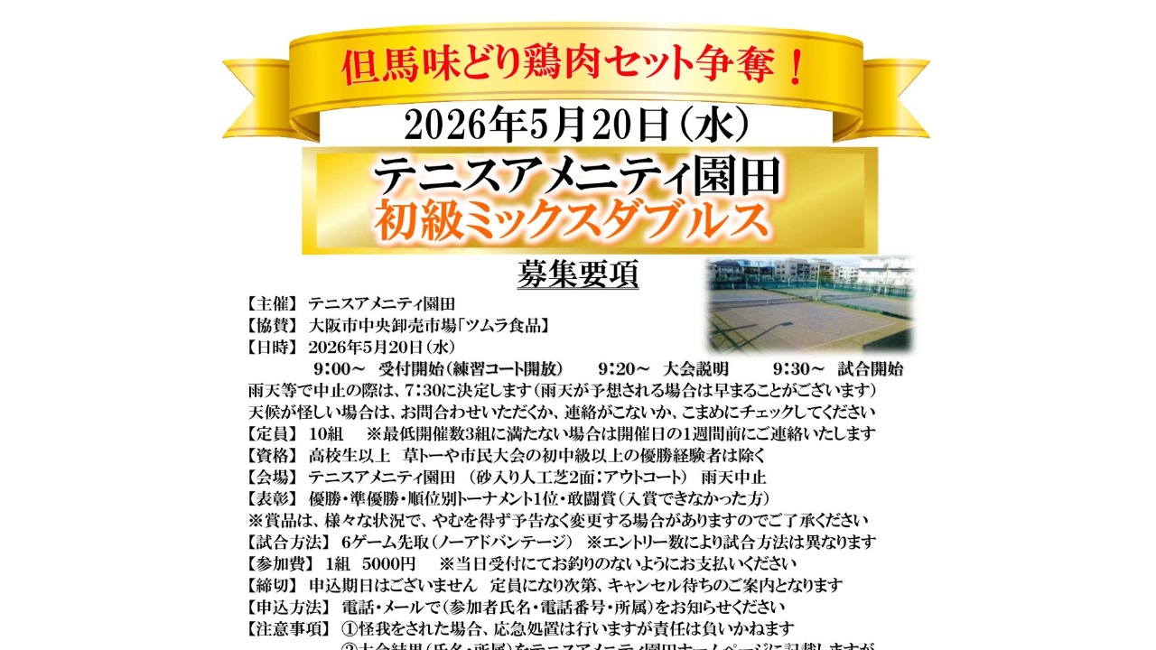 【市場直送!ブランド但馬味どり 鶏肉セット争奪!】初級ミックスダブルス大会 テニスアメニティ園田