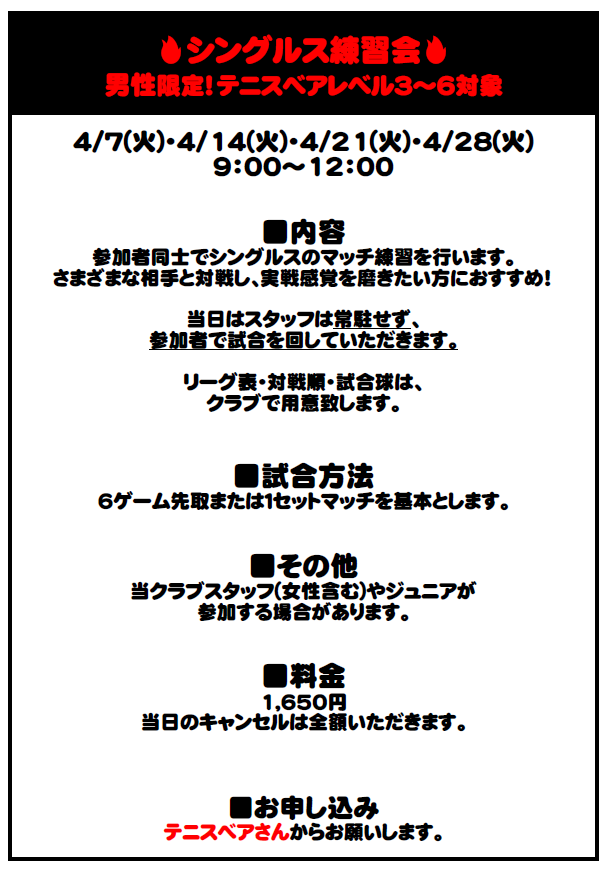 試合形式は6ゲーム先取・ノーアドまたは1セットマッチを基本とします。