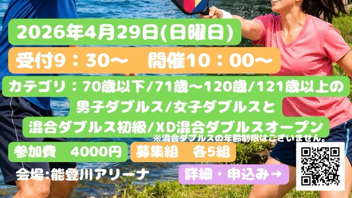 ・カテゴリーは女子ダブルスで総当たり戦を行います。ペアの条件としてペアの合計年齢で募集致します。