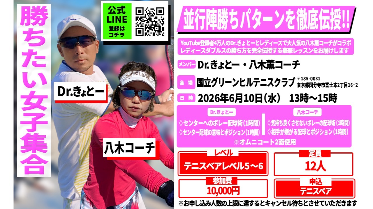 【国立グリーンヒルテニスクラブ】にて、Dr.きょとー&八木コーチによる【並行陣勝ちパターンを徹底レッスン】を行います!
