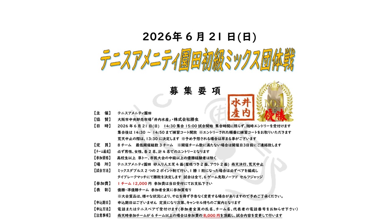 大会日の1週間前以降のキャンセル、又は試合進行に不都合が出る場合(その場合棄権となる) では、参加費の全額をお支払い頂きますのでご了承ください。
