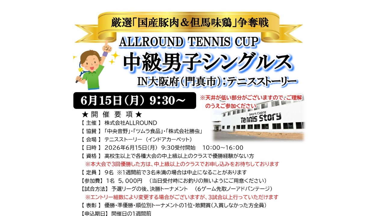 【市場厳選!国産豚肉&但馬味鶏争奪!】中級男子シングルス大会 門真市:テニスストーリー