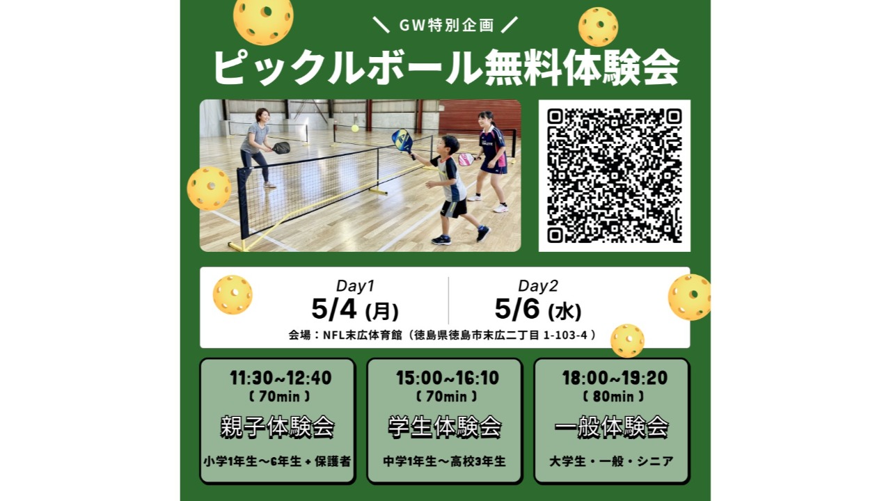 今年のゴールデンウィーク、新しいスポーツに挑戦してみませんか?運動が苦手な方でも、すぐにラリーが楽しめるのが「ピックルボール」の魅力です。NFL末広体育館は、GW特別企画として全世代の方に向けた【無料体験会】を開催します🙌