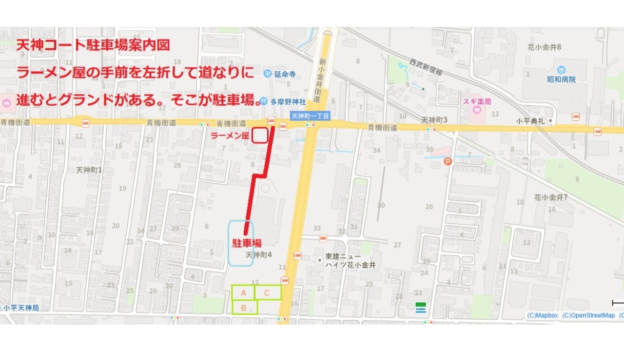 青梅街道を昭和病院から西にむかって行って、新小金井街道を過ぎて天神ラーメン(ジャンボ餃子)の手前を左折して、道なりに(クランク)進むと突き当りにグランドにぶつかります、そこが駐車場になります。