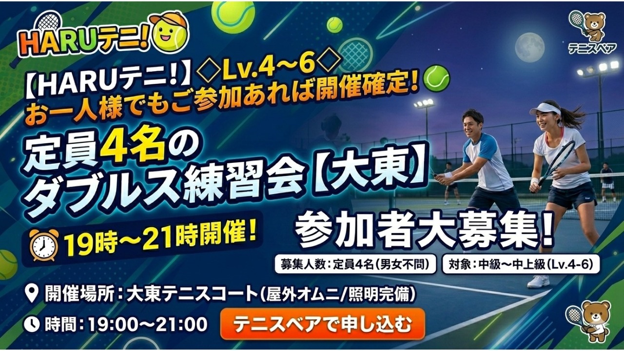 【HARUテニ!】◇Lv.4~6◇お一人様でもご参加あれば開催確定!定員4名のダブルス練習会【大東】